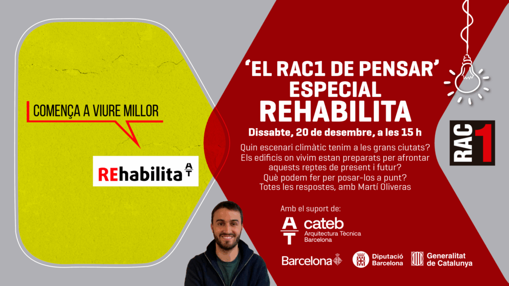Dissabte passat, 20 de desembre, es va emetre una edició especial del programa “RAC1 de pensar”, dedicada a la rehabilitació dels edificis davant el repte del canvi climàtic, amb la col·laboració del Cateb en el marc del projecte REhabilita.