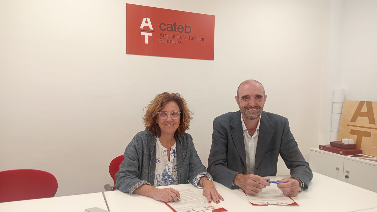 En la foto, Isabel Pagonabarraga, directora general del Cateb i Ferran Roig Astor, com a director general d’Obres i Serveis Roig, en el moment de la signatura del conveni de col·laboració.